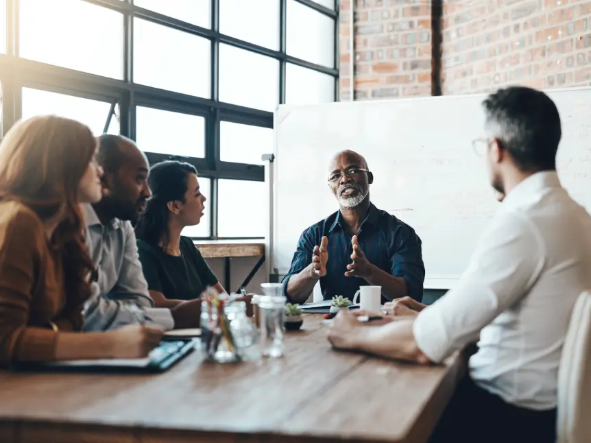 Senior leadership team reviewing reports and performance data during strategic resilience diagnostic meeting.